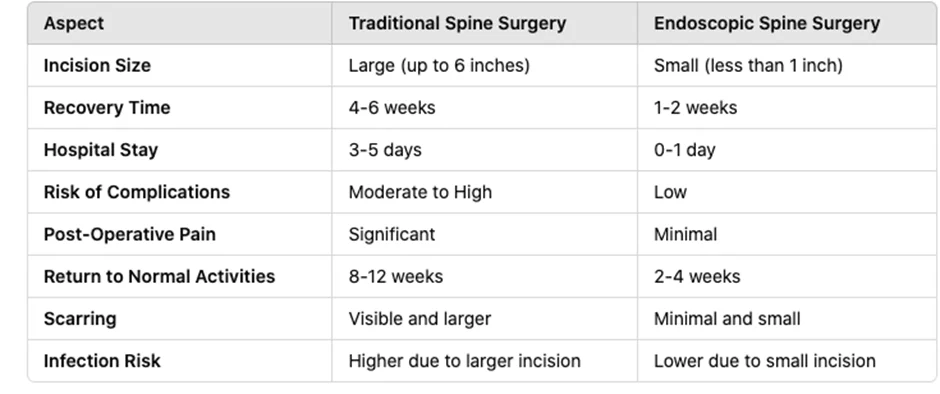 Contrast healing duration, cut size, and danger of trouble between old-school spine surgery and the endoscopic kind.